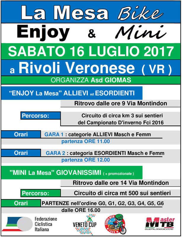 VENETO CUP & KIDS: ENJOY LA MESA BIKE, SABATO 16 LUGLIO A RIVOLI VERONESE E LA MESA MINI CON I KIDS